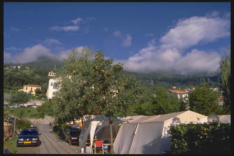 In Pianello treibt am Morgen der Wind die Wolken auf die Berge, wo sie sich im Licht dann auflösen. Im Vordergrund übrigens die Zelte von HRC und RVB.