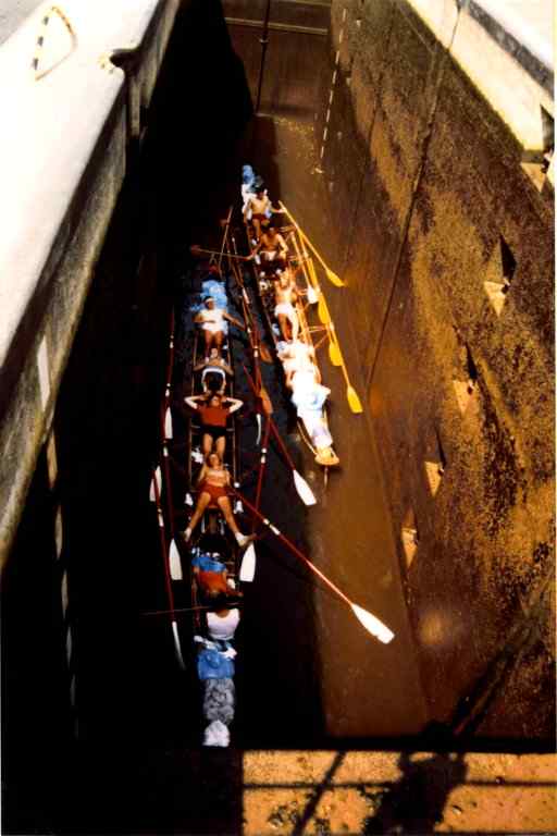 Imposant wirkten auf uns die Sportbootschleusen der Mosel. Wenn überhaupt, dann kannten wir nur breite Schleusen mit wenig Hub. Doch diese Dinger, gerade so breit, dass zwei Vierer mit Skulls lang und verschränkten Auslegern neben einander passen ... und dabei teilweise so hoch wie ein Vierer lang ist. Das ganze noch selbst bedient ...