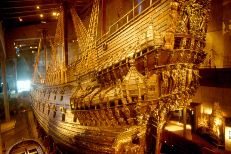 Nicht weit von Djurgården entfernt liegt das Freilichtmuseum auf der Insel Fjäderholmarna (rechts), ideal für eine erste Probefahrt. Fjäderholmarna ist nicht wirklich klein, man beachte die Boote dort und vor der Nachbarinsel. Trotzdem wirkt das Schiff, als wäre es ein Modell im falschen Maßstab.
