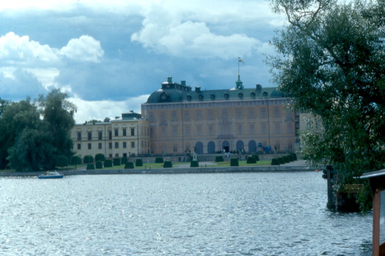 Es klingt wie ein Dreiersofa von IKEA, ist aber ein Schloss ;-) Drottningholm, im Mälaren westlich von Stockholm. Mindestens ein Mitglied der königlichen Familie ist anwesend, wie die Fahnen zeigen. Das merkwürdige Aussehen der Fassade in der Mitte kommt daher, dass gerade renoviert wurde und man das Gerüst mit bemalten Planen möglichst passend gestaltet hatte. Bis auf den Wohntrakt des Königs sind Schloss und Park der Öffentlichkeit zugänglich. Man störte sich zumindest draußen auch nicht an Ruderern mit nassen Schuhen.