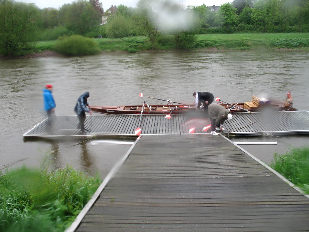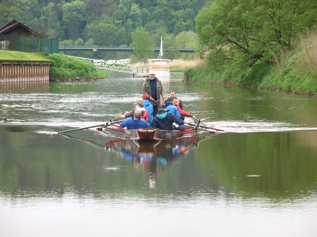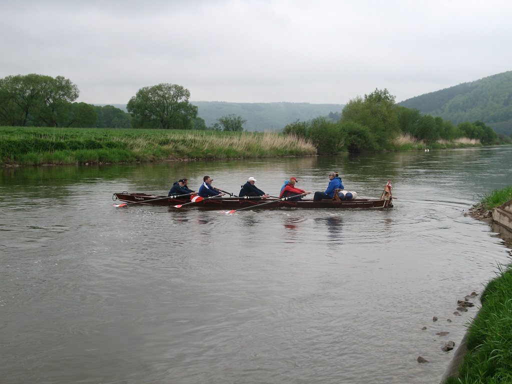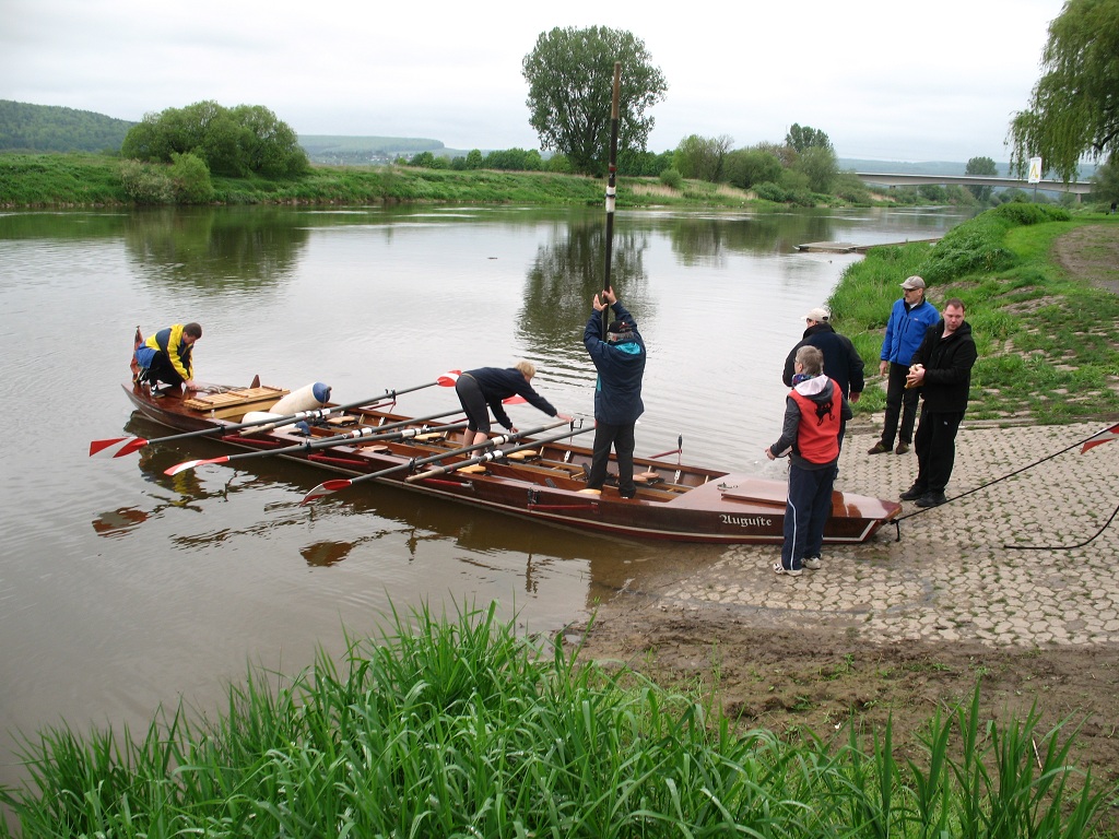 5. Mai 2012: Frühstück um 7:30 Uhr, das hatten wir an der Weser lange nicht mehr. Jugendherbergsmäßig gut versorgt, machen wir uns auf den Weg zum Etappenziel Oedelsheim. Es ist zwar kalt, aber praktisch trocken. Ein Teil der Gruppe nimmt mangels Bootsplätzen das Fahrrad, ist damit wegen des manchmal doch kräftigen Anstiegs auf dem Weserradweg und der gern mal abspringenden Fahrradkette nur bedingt glücklich. Somit ist Auguste, kurz vor 11:30 Uhr, noch vor den Radlern in Oedelsheim.