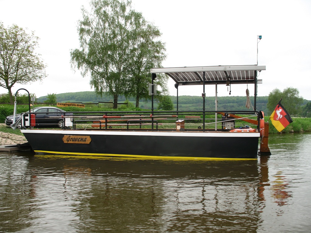 Nächstes Ziel ist wiederum Grave. Dort angekommen, besteht jedoch bei niemandem an Bord Bedarf nach einer Landpause, so dass wir kurzfristig beschließen, auf dem Wasser zu bleiben und uns treiben zu lassen. Wir haben das gerade etwa 500 Meter weit getan, als das Telefon klingelt: In Bodenwerder keine rückenschonende Möglichkeit, Auguste aus dem Wasser zu bekommen, und vorher auch nicht. Für uns kommt nun der Höhepunkt der Fahrt, unser Schiffchen rund 600 m gegen die Strömung zu rudern. Es geht langsam voran, etwa 1 Meter pro Schlag statt wie sonst 10, aber immerhin. Sehenswert ist die Fähre Grave. Jahre nach Einstellung der alten Fähre 1977 mangels Fährmann investierte der 2003 gegründete Kultur- und Fährverein in den Bau einer mittels Solarenergie betriebenen Personen- und Fahrradfähre. Seit 2005 gibt es nun einen von Ehrenamtlichen durchgeführten Fährverkehr. Fahrzeuge mit Verbrennungsmotor werden aus Brandschutzgründen nicht transportiert, Fahrräder mit Elektromotor aber schon. Mehr Informationen gibt es auf der Homepage des Vereins. Bitte auch beachten, dass werktags nun erst ab 14 Uhr Betrieb ist, die Gemeinde gibt noch 10 Uhr an. Bilder vom Bau der Fähre gibt es auch bei der Wikinger-Werft. Dass das Fahrzeug wie beworben mit den beiden Riemen gerudert werden kann, halten wir aber für eine heftige Übertreibung. Der Leser möge die beiden Stöckchen (die eine Person gar nicht gleichzeitig ins Wasser bekommt) mit den acht Riemen Augustes vergleichen, wobei Auguste wahrscheinlich noch strömungsgünstiger gebaut ist. Nach Aussage des anwesenden Fährmanns bekommt Gravena achtern noch einen Elektro-Hilfsantrieb für den Notfall.