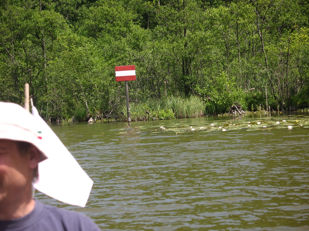 Unsere Tour führt durch den nächsten Kanal Richtung Süden zum Schlabornsee und dort nach Osten in den Bikowsee, der direkt an Österreich grenzt (alter Witz ...) Mit Paddelbooten käme man hier vielleicht noch weiter, wir mit Ruderbooten aber nicht, und verboten ist es ohnehin.