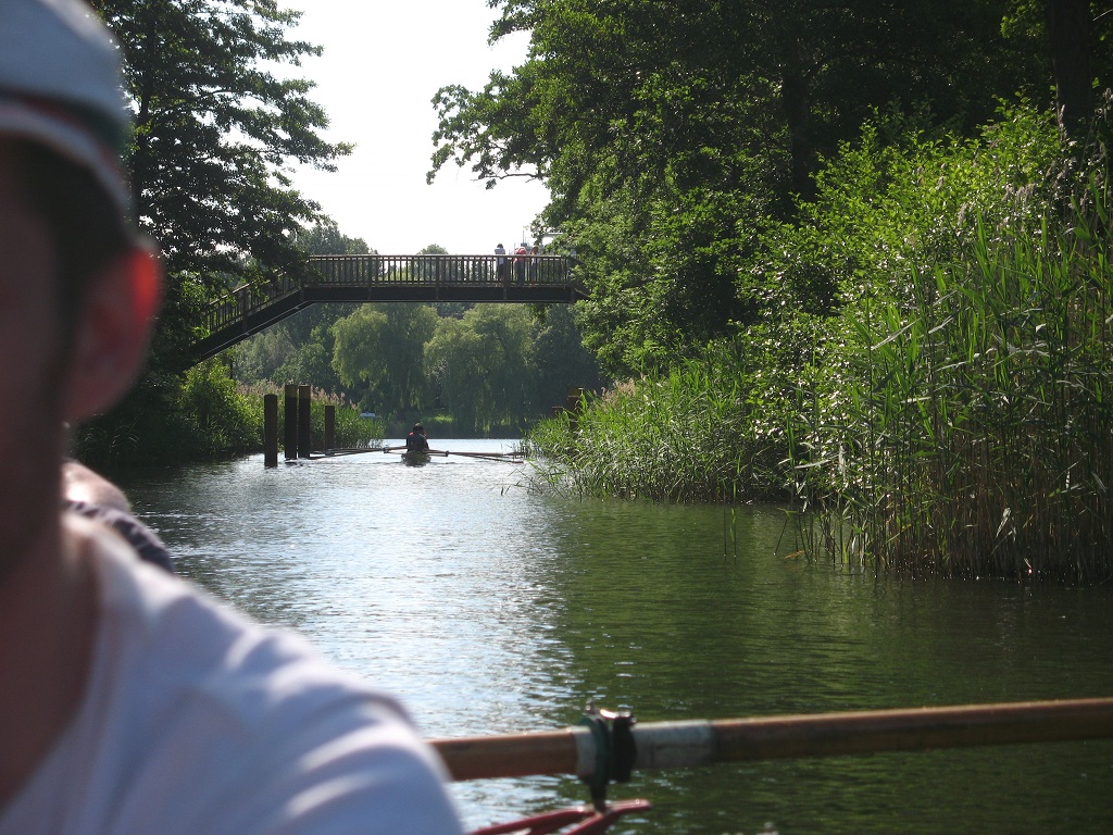 Von der Rückfahrt nach Flecken Zechlin noch zwei Bilder. Zwecks Vereinfachung der Organisation halten wir es die gesamte Woche über so, dass wir abends mit den Booten zum Bootshaus zurück kehren. Das erspart die Rödelei mit Autos oder anderen Verkehrsmitteln (wobei der Bahnanschluss von Rheinsberg nach Flecken Zechlin schon 1945 stillgelegt wurde) und erlaubt die tägliche Anpassung der Bootsplätze an die Zahl der Ruderwilligen (bzw. -fähigen).