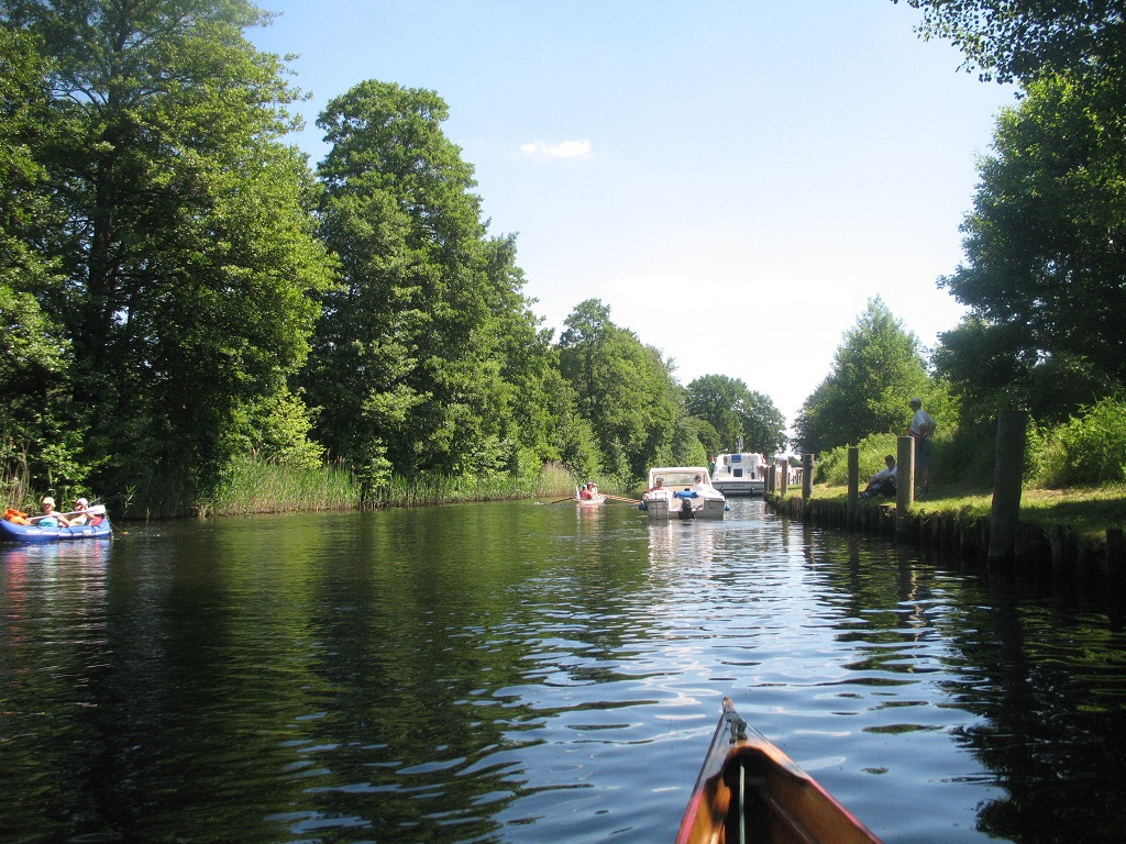 Auf der Strecke nach Canow wird die Schleuse Wolfsbruch passiert, die im Prebelowkanal die Rheinsberger Gewässer mit den nördlicheren Gewässern des Neustrelitzer Kleinseengebiets verbindet und 40 cm Höhenunterschied bewältigt. Eigentlich ist der Prebelowkanal der nördliche bzw. östliche Teil des Hüttenkanals. Die östliche Mündung in den Kleinen Pälitzsee markiert auch die Grenze zu Mecklenburg-Vorpommern. Obwohl man meist von der Mecklenburger Seenplatte spicht, halten wir uns während der Wanderfahrt also zumeist in Brandenburg auf.