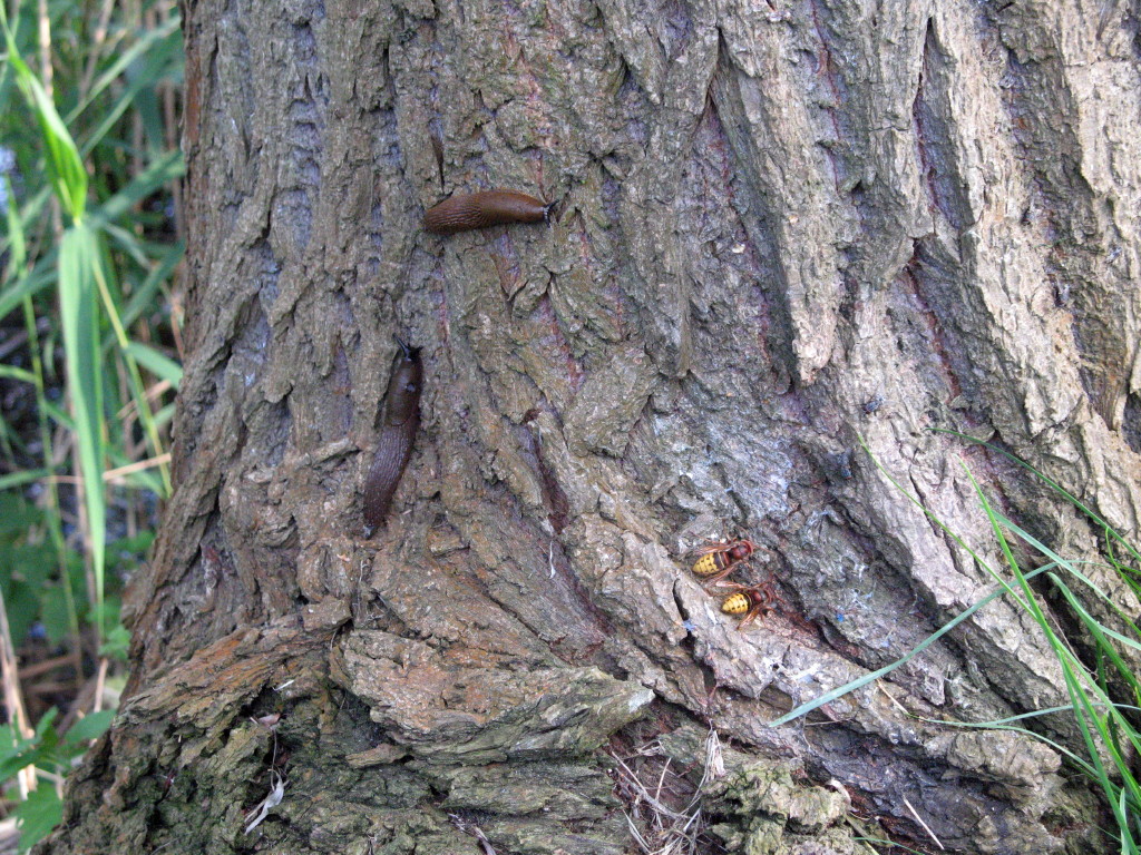 Abends überrascht uns die Weide am Bootshaus: An einer bestimmten Stelle tummeln sich diverse Fliegen, Wespen, Hornissen (Vespa crabro) und schließlich Nacktschnecken (vermutlich Spanische Wegschnecke Arion vulgaris). Zwischendurch schaut auch ein Schmetterling (ein Admiral Vanessa atalanta) vorbei. Um was es an der Stelle geht, finden wir nicht heraus. Vielleicht hat der Baum eine kleine Wunde und sondert Saft ab oder es liegt dort ein kleines Aas. Jedenfalls geben die Hornissen angesichts der Schnecken auf.