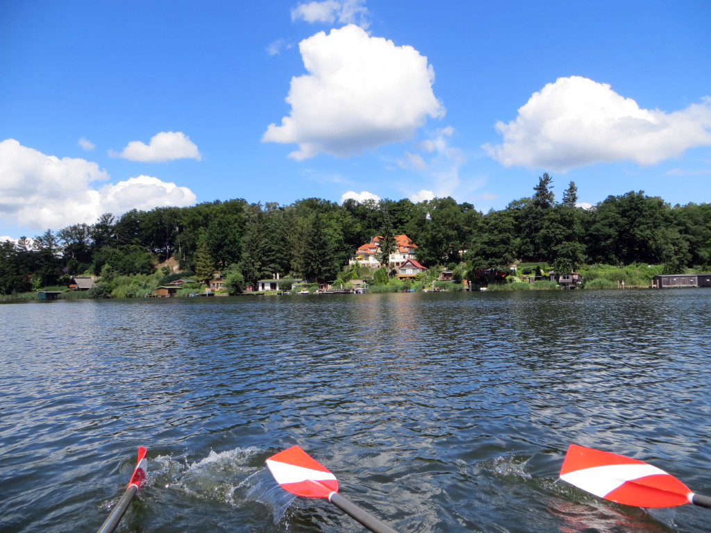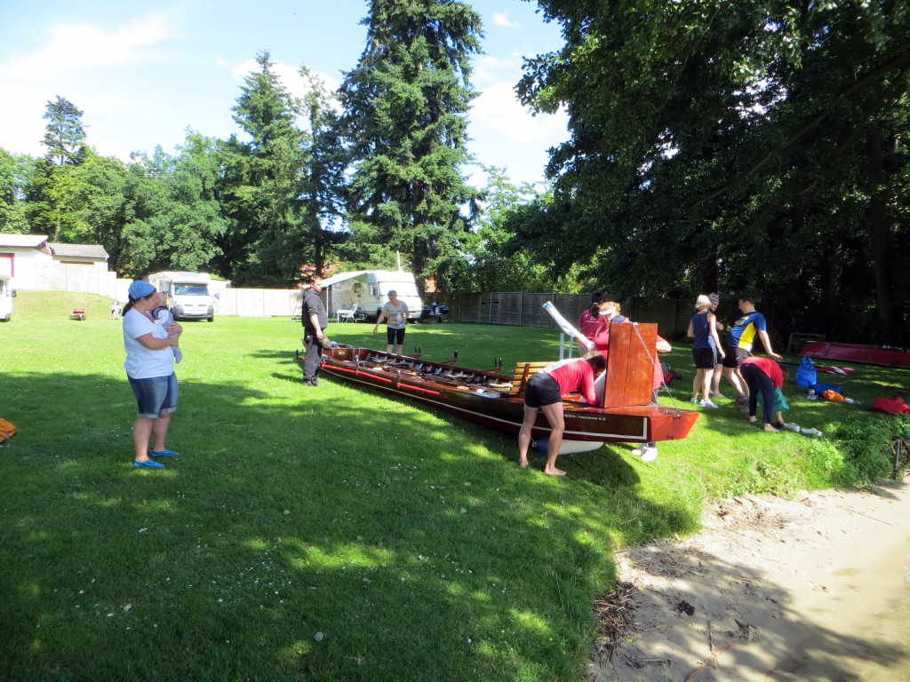 22. Juli 2012: Die Sonne lacht uns morgens an. Nach dem eher schlechten Wetter der letzten Wochen macht das Hoffnung auf eine trockene Woche. Da noch nicht die gesamte Mannschaft vor Ort ist, ist erst einmal eine kleine Runde zum Warmfahren geplant. Zuerst geht es aber in Richtung Flecken, um dort eine Mitruderin direkt aus dem eigenen Garten abzuholen. Unter bzw. sogar in der Weide angelegt, gibt es zur Begrüßung erst einmal einen Becher Wein.