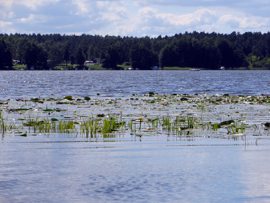 Es geht in den allseits beliebten Bikowsee. Im Hintergrund der Campingplatz, im Vordergrund ein paar Gelbe Teichrosen (Nuphar lutea). Teichrosen sind eine Gattung innerhalb der Familie der Seerosengewächse (Nymphaeaceae), zu denen auch die Gattung der Seerosen (Nymphaea) gehört. Einige Vertreter davon, genauer der Art Weiße Seerose (Nymphaea alba), sind im hinteren Teil zu sehen.